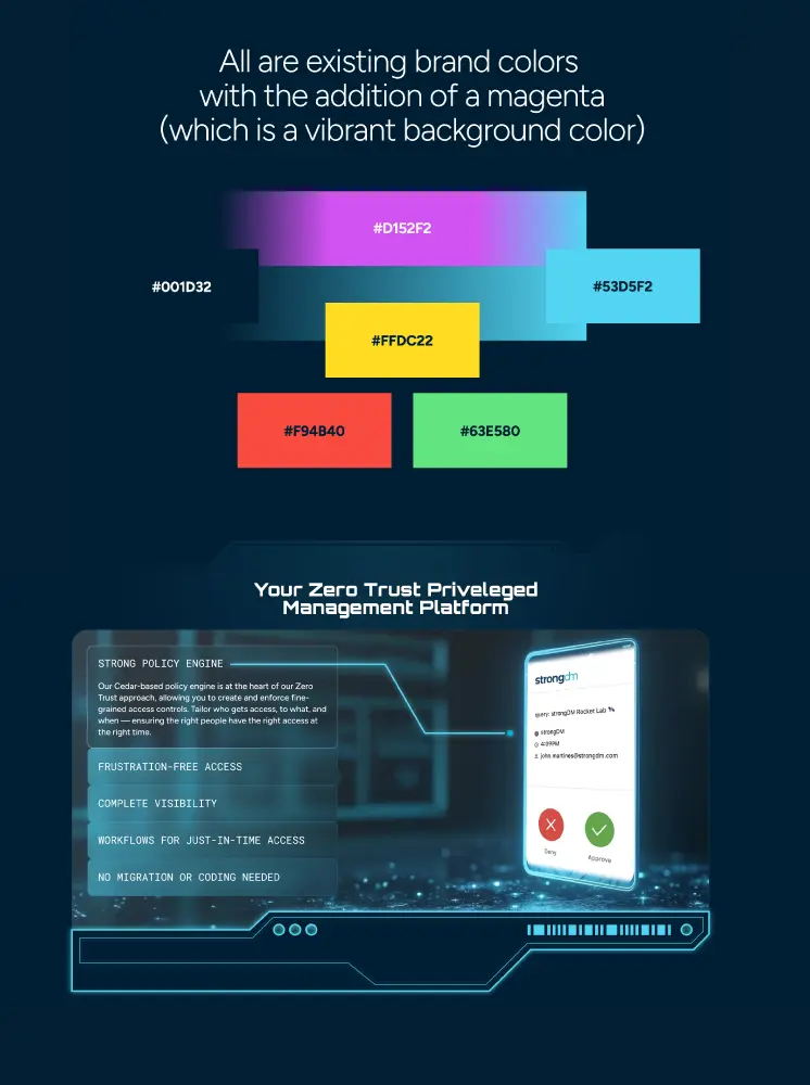 Prompt introduced astrategic design that evolved StrongDM's brand without a complete overhaul. Leveraging existing typography, color, and visual foundations, we maintained brand equity while opening space for differentiation and market positioning.